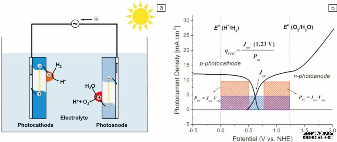 圖1 p-n 疊層光電化學水分解電池示意圖(a) 和性能曲線(b)